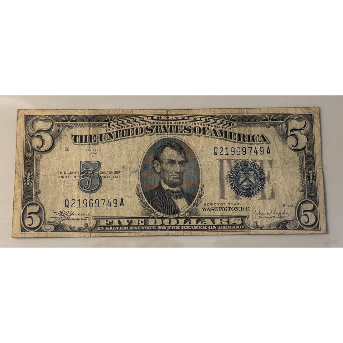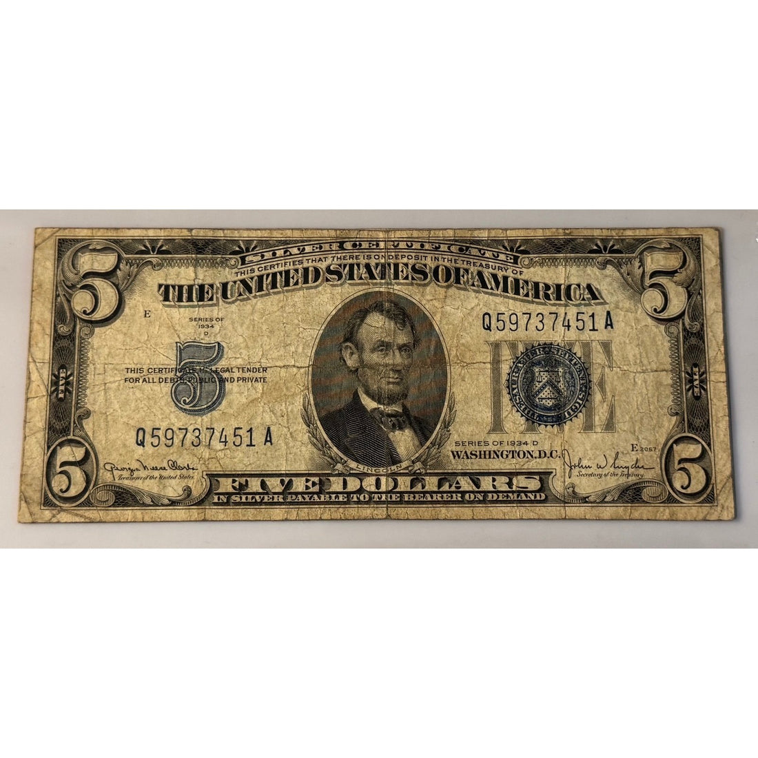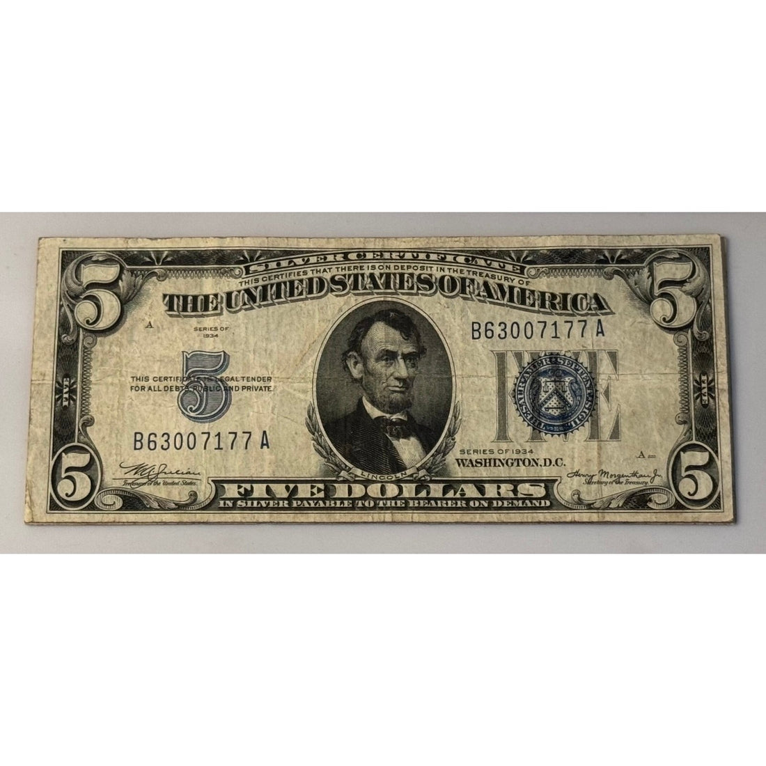 Vintage 1934 $5 Silver Certificate featuring Abraham Lincoln with a blue Treasury seal.Signed by Julian...