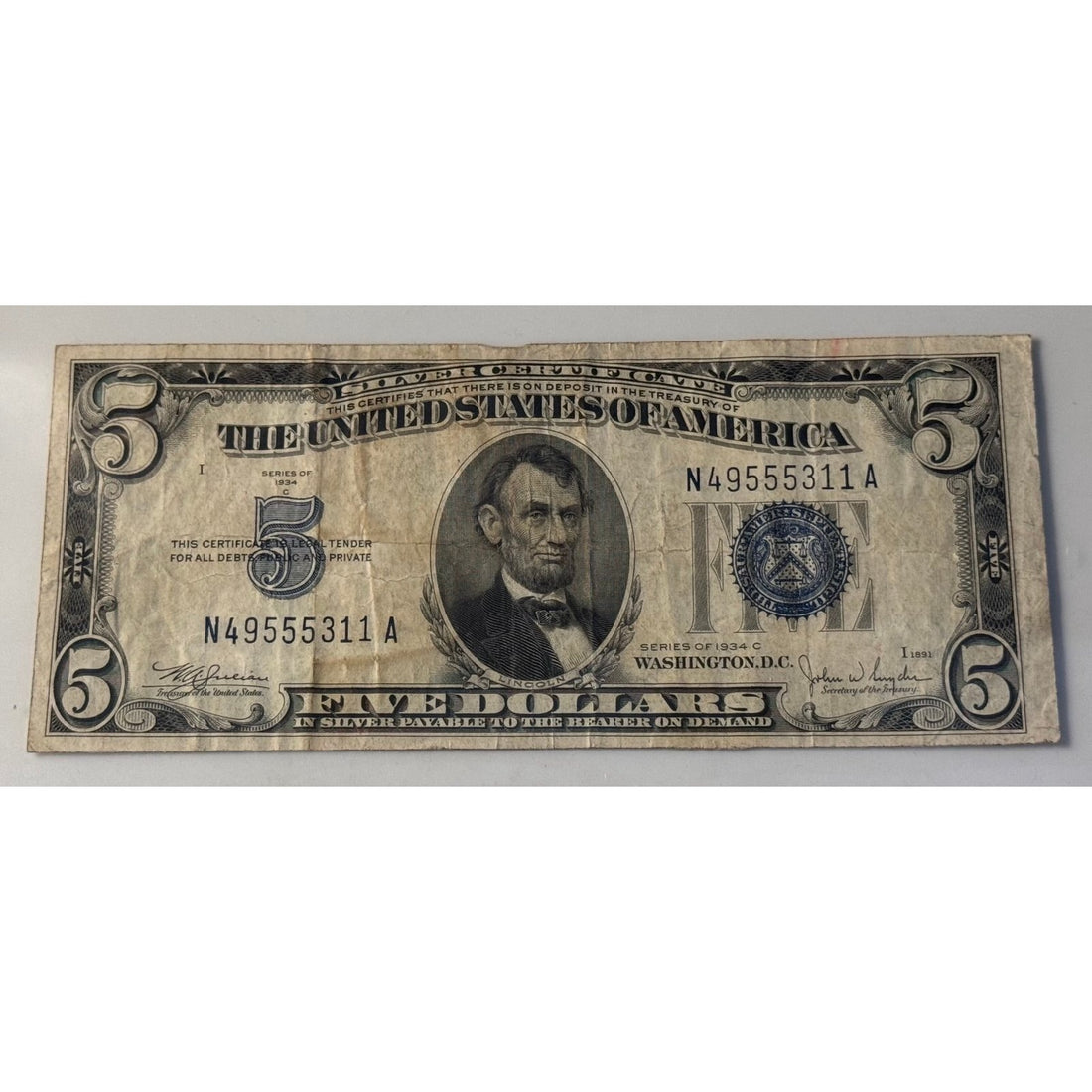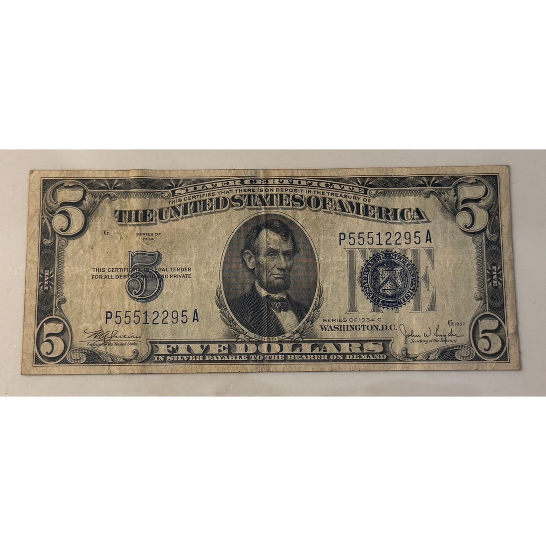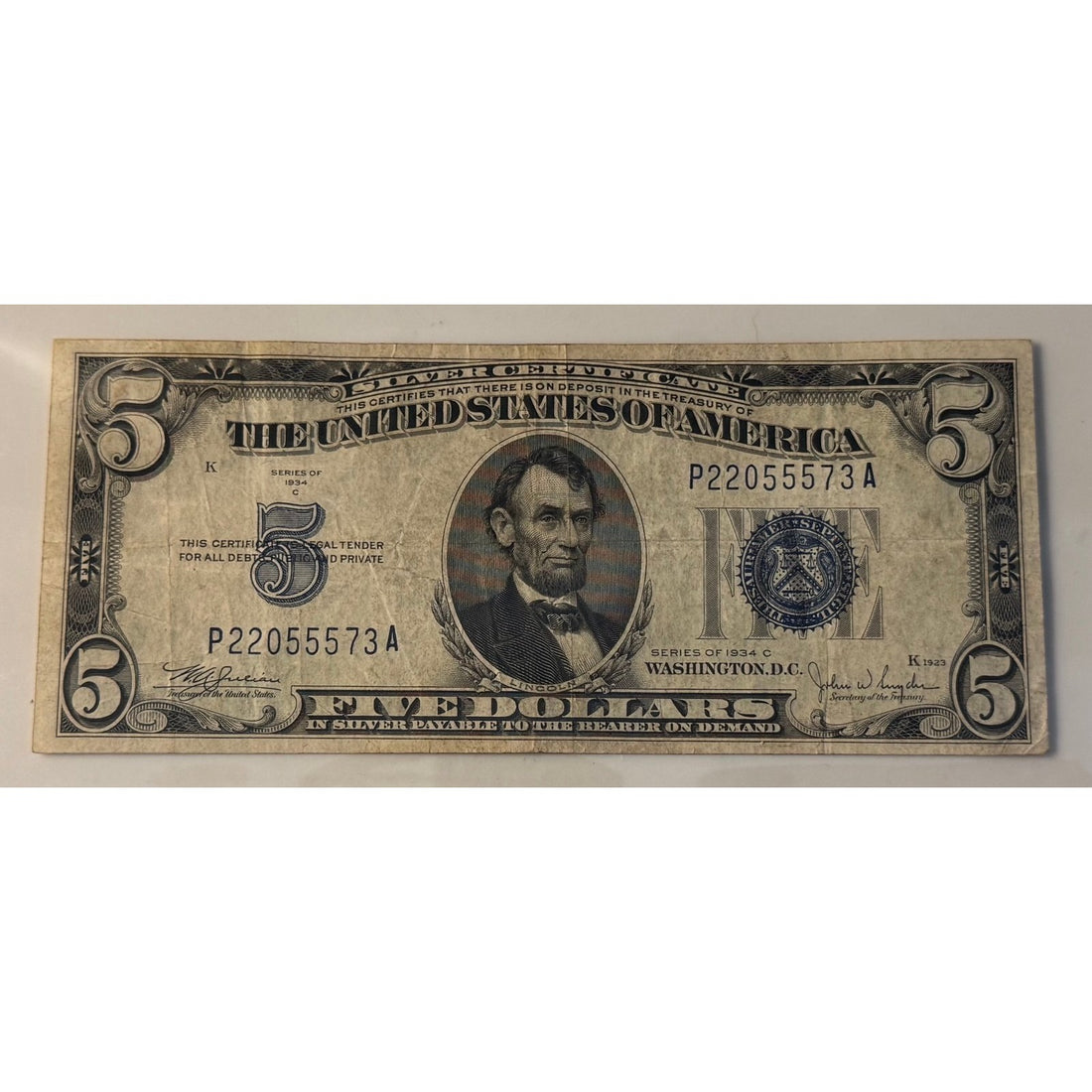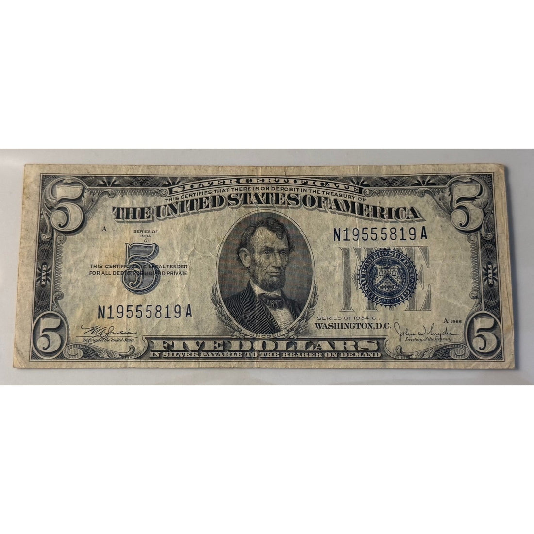 Vintage 1934 $5 Silver Certificate featuring Abraham Lincoln with a blue Treasury seal.Signed by Julian...
