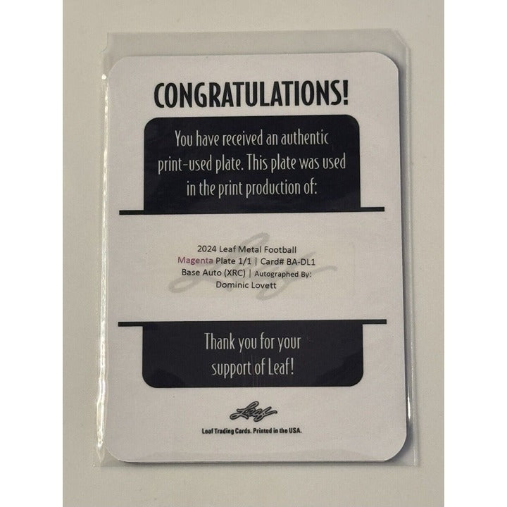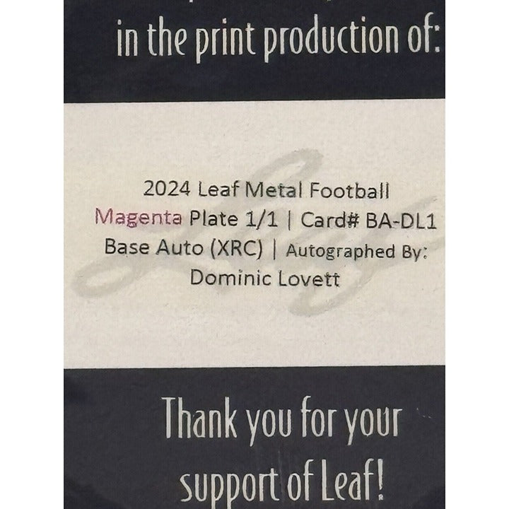 1/1 Limited Editon! DOMINIC LOVETT RC Auto UGA 2024 LEAF METAL XRC - PRINT PLATE