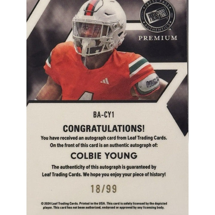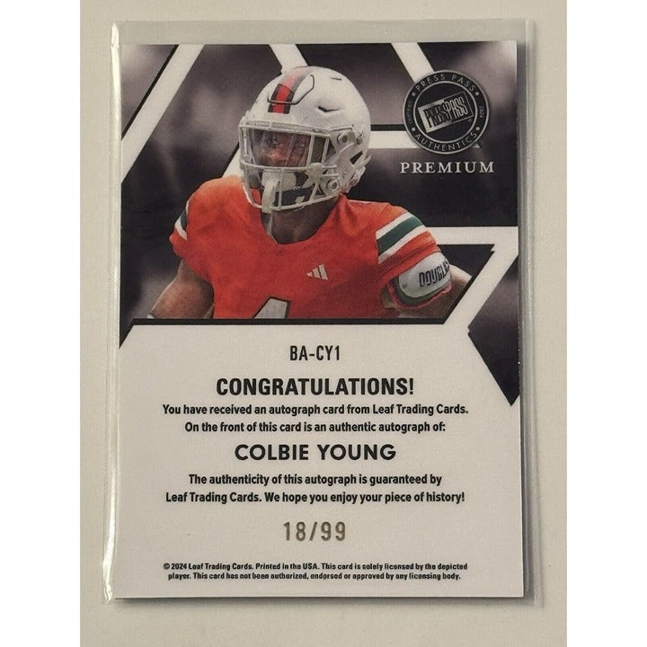 18/99 COLBIE YOUNG RC* Auto 2024 LEAF PRESS PASS PREMIUM - UGA Dogs Card #BA-CY1