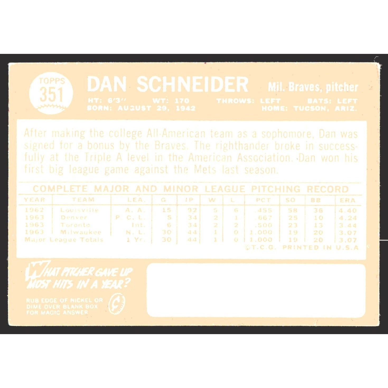 1964 Topps #351 Dan Schneider Atlanta Braves VG- Very Good -EX- Excellent