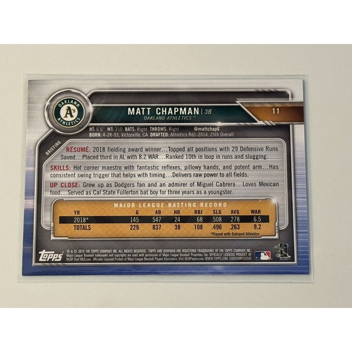 2019 Bowman Baseball 407/499 Matt Chapman MLB A.L. Oakland Athletics - Card #11
