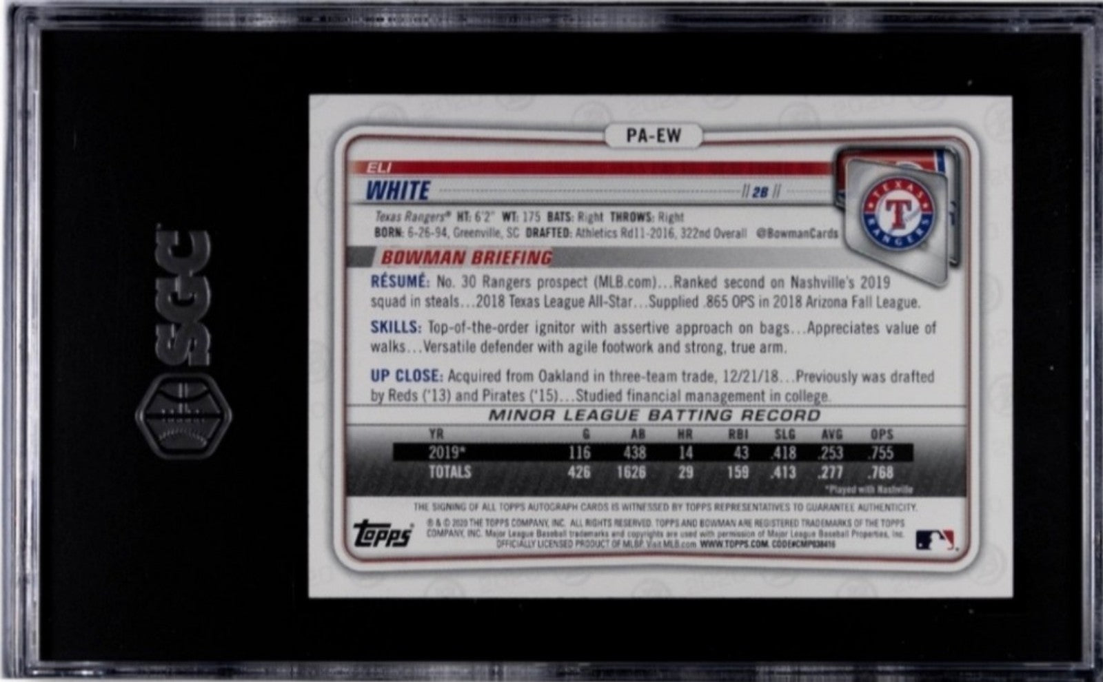 2020 BOWMAN PROS. ELI WHITE Rookie Auto Card PA-EW MLB Atlanta Braves - SGC 9.5