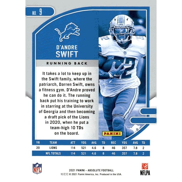 2021 Panini Absolute NFL Parallel Football Card #9 D'Andre Swift Parallel Lions*