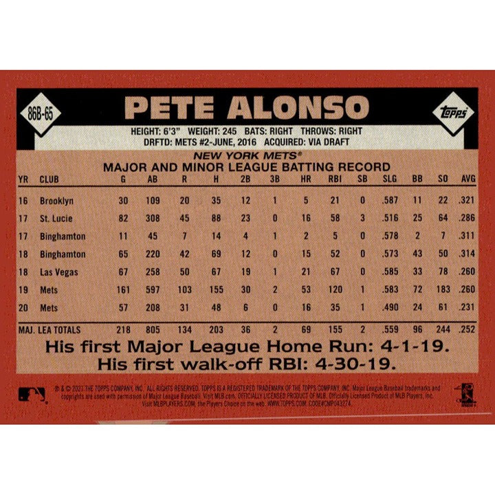 2021 Topps #86B-65 Pete Alonso 1986 Topps Baseball - 35th Anniversary (Series 1)