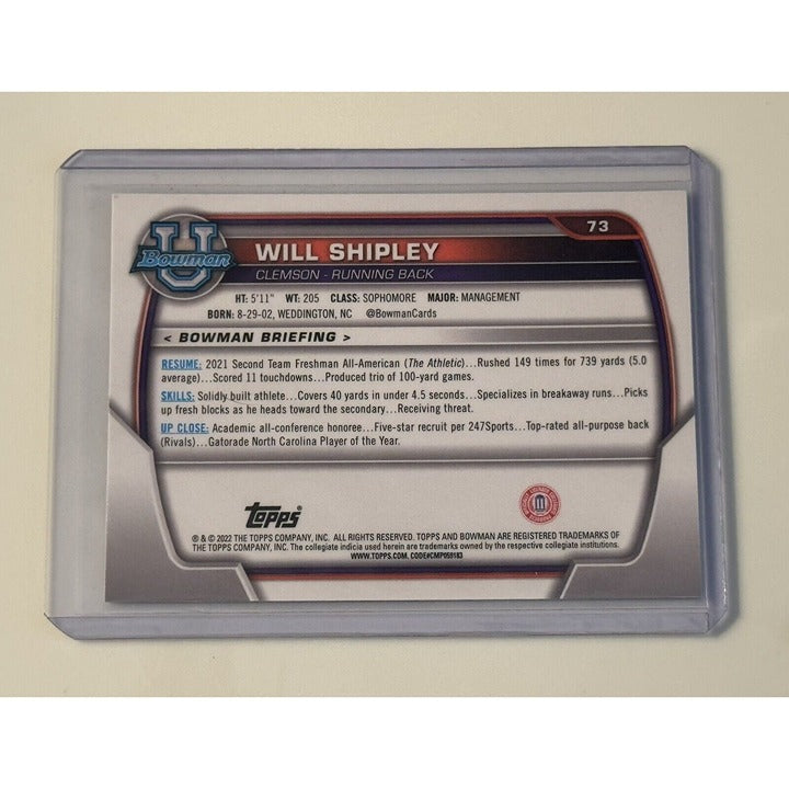 2022 1st Bowman Chrome University Will Shipley RC - NCAA Tigers / NFL Eagles #73