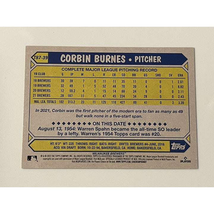 2022 Topps 1987 Baseball - Corbin Burnes - MLB Milwaukee Brewers NL Card #T87-39