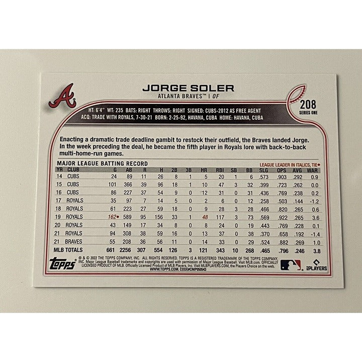 2022 Topps Jorge Soler* - MLB Atlanta Braves/Miami Marlins - Baseball Card #208*