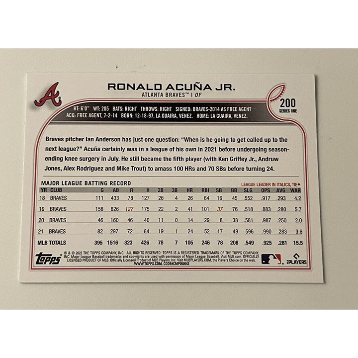 2022 Topps Series 1 Ronald Acuna Jr. MLB Atlanta Braves Baseball Card #200 40/70