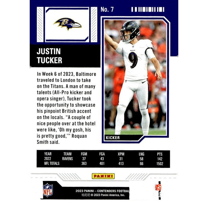 2023 Panini Contenders Justin Tucker* Season Ticket Retail NFL Ravens - Card #7*