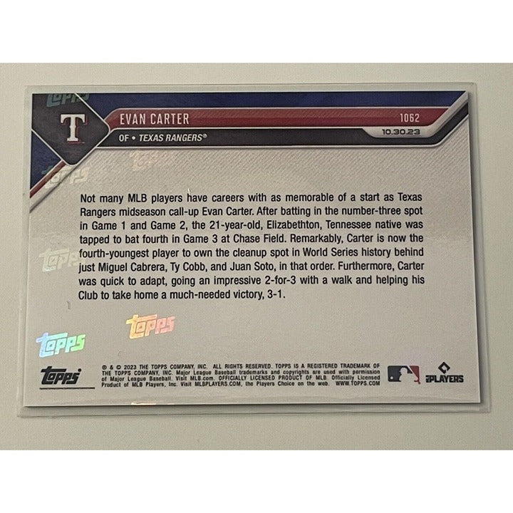 2023 ToppsNOW Evan Carter - 4th Youngest To Bat Cleanup In WS Game #1062 Rangers