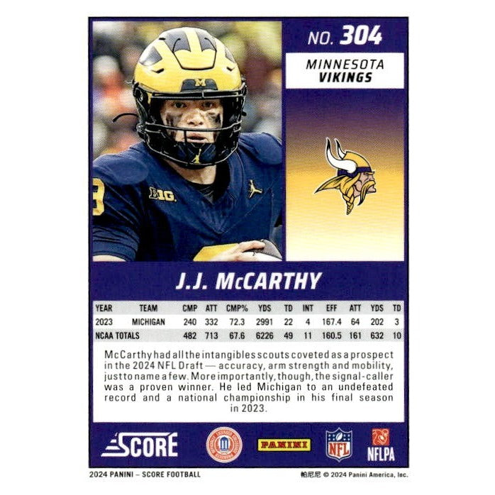 2024 NFL Score Football J.J. McCarthy Red RC* #304 Minnesota Vikings - Near Mint
