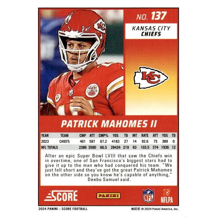 2024 NFL Score Football Patrick Mahomes II - Scorecard #137 - Kansas City Chiefs