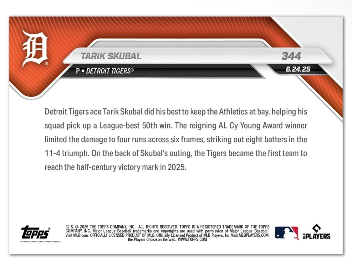 2025 MLB Topps Now Tarik Skubal 50 wins for 1st Place Detroit Tigers Card #344