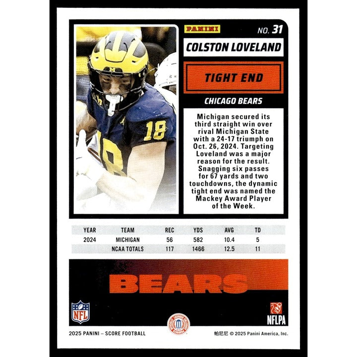 2025 Panini Score NFL Football Card #31 Colston Loveland Rookie Bears Near Mint