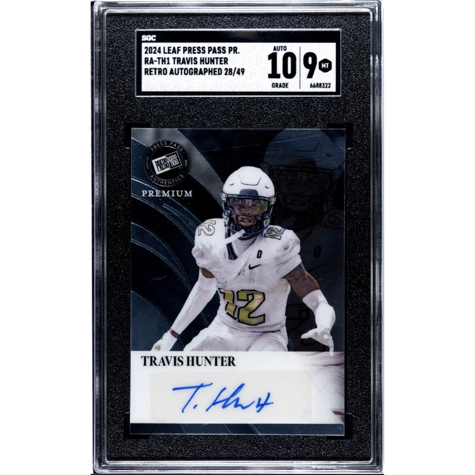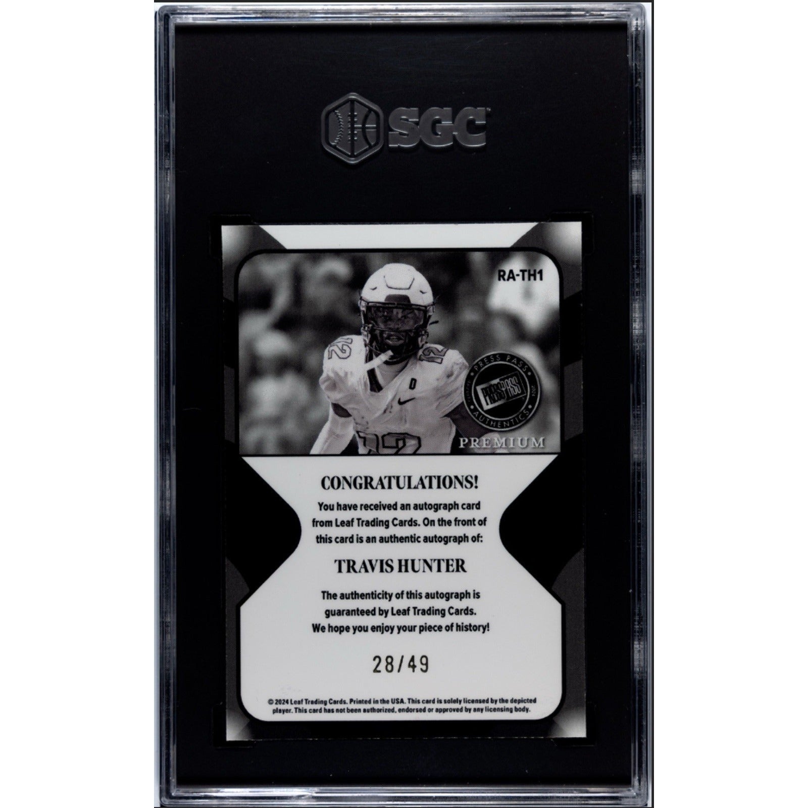 28/49 2024 Leaf Press Pass Premium -Travis Hunter RC Auto Retro #RA-TH1 - SGC 9