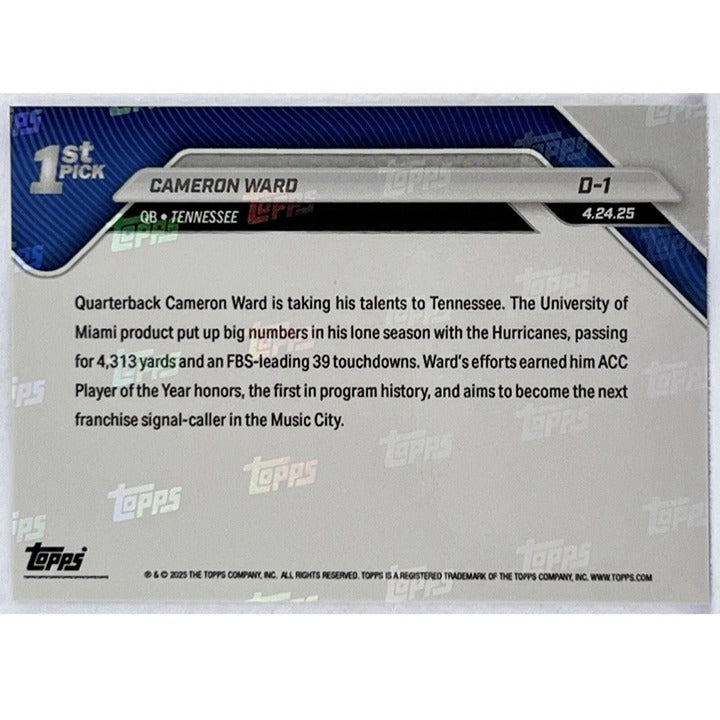 Cameron Ward RC* 2025 Topps Now 1st* Pick Draft Card #D-1 - NFL Tennessee Titans