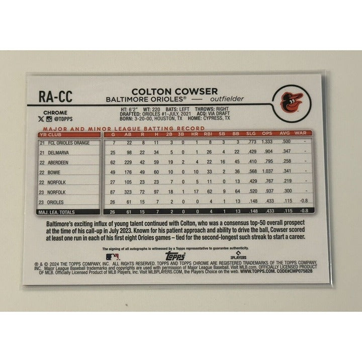 Colton Cowser RC On Card Auto - 2024 Topps Chrome #RA-CC Refractor - MLB Orioles