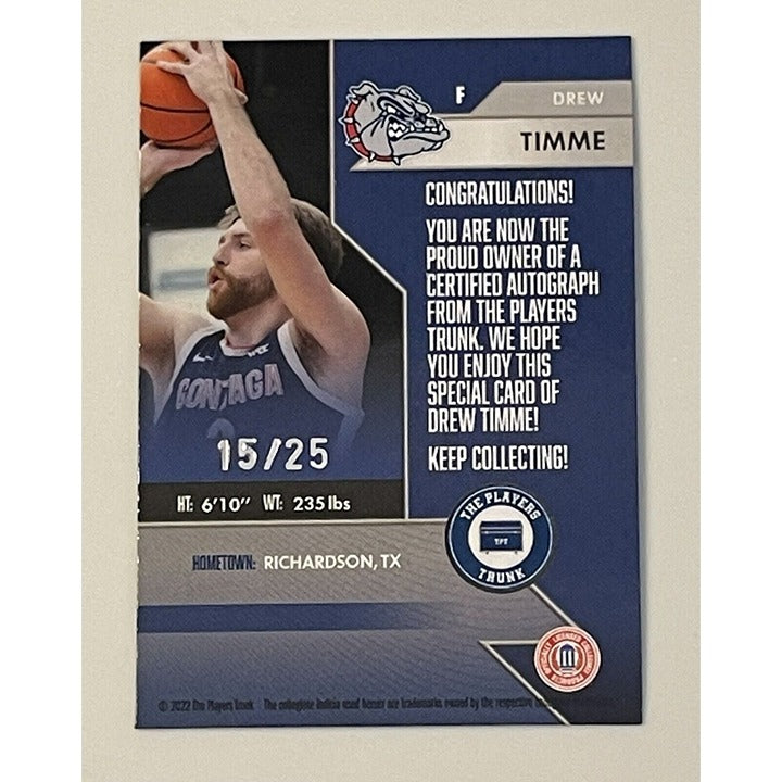 Drew Timme 15/25 AUTO 2022 Campus Collection Players Trunk Card Gonzaga Bulldogs