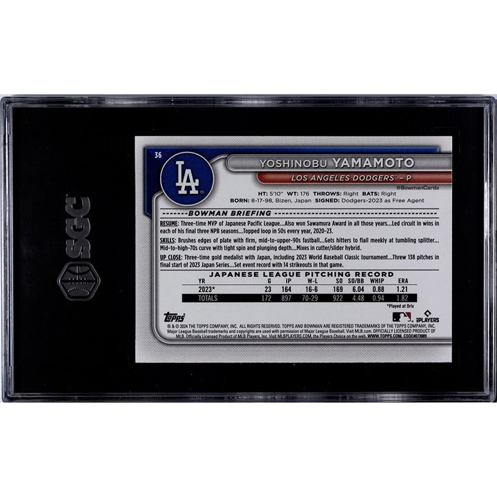 Yoshinobu Yamamoto RC 2024 Bowman Card #36 MLB Los Angeles Dodgers Rookie SGC 10